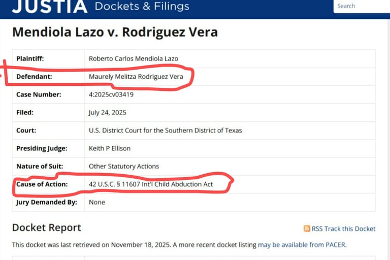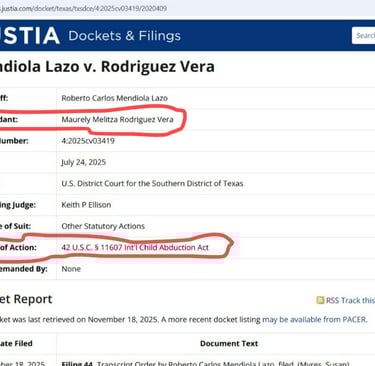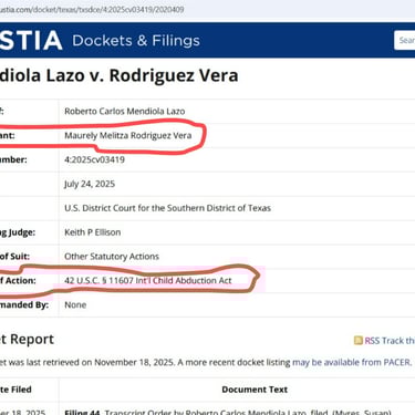 • There is currently a pending case against Mrs. Maurely Rodriguez Vera in the United States District Court for the Western District of Texas seeking the child’s return under the Hague Convention (Case No. 4:2025cv03419), related to an alleged international parental child abduction.